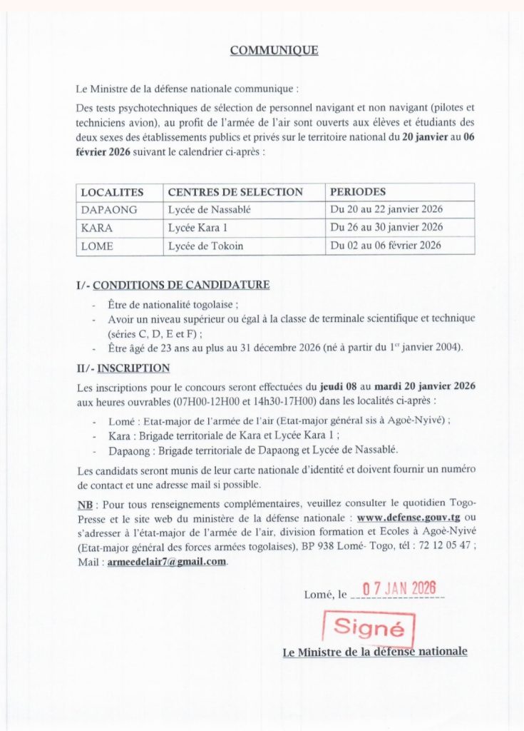 L’armée de l’air annonce l’ouverture des tests psychotechniques de sélection du personnel navigant et non navigant, notamment pour les postes de pilotes et de techniciens avion. Ces tests s’adressent aux élèves et étudiants des deux sexes, issus des établissements publics et privés sur l’ensemble du territoire national.